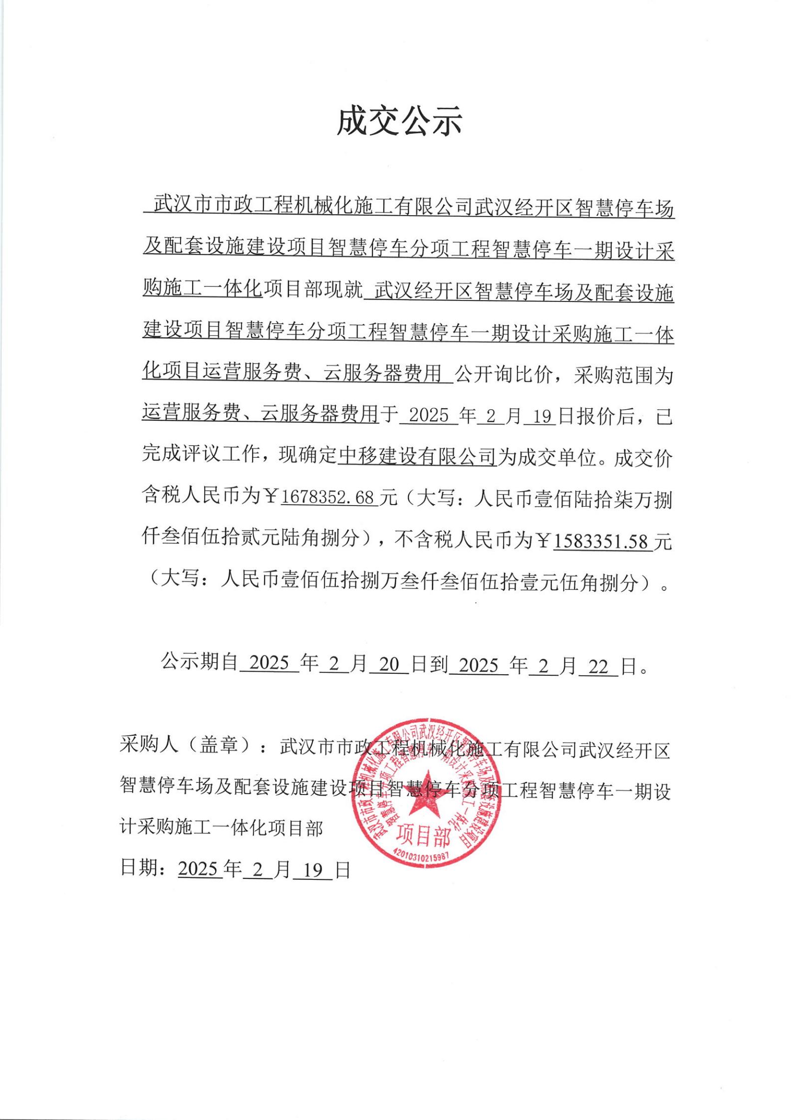 武漢經(jīng)開區(qū)智慧停車場及配套設(shè)施建設(shè)項目智慧停車分項工程智慧停車一期設(shè)計采購施工一體化項目運營服務(wù)費、云服務(wù)器費用成交公示
